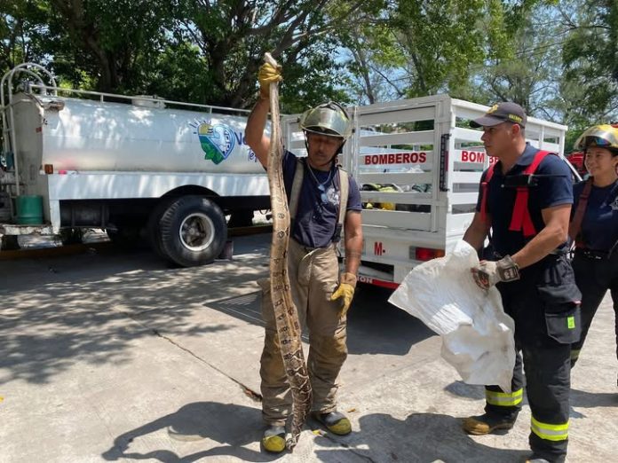 La mañana de este jueves, una serpiente boa constrictor de aproximadamente dos metros de longitud fue capturada por elementos de Bomberos Municipales en la zona norte del puerto de Veracruz, luego de que fuera sorprendida mientras intentaba devorar a un gato.