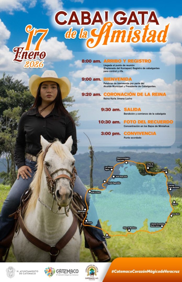 El alcalde de Catemaco, Manuel Eduardo Toscano, dio a conocer a través de sus redes sociales el programa y la ruta oficial de la Cabalgata de la Amistad, evento organizado por la Asociación de Cabalgantes del Lago de Catemaco.