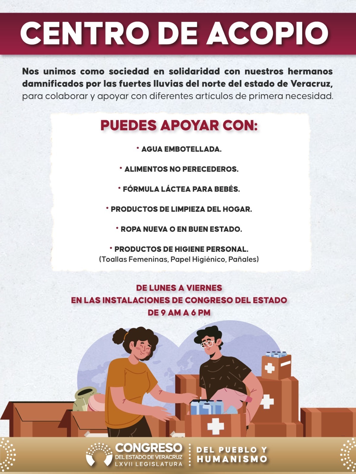 Xalapa, Ver. — El Centro de Acopio instalado en el Palacio Legislativo de Veracruz permanece abierto para recibir donaciones en apoyo a las familias afectadas por las recientes contingencias.