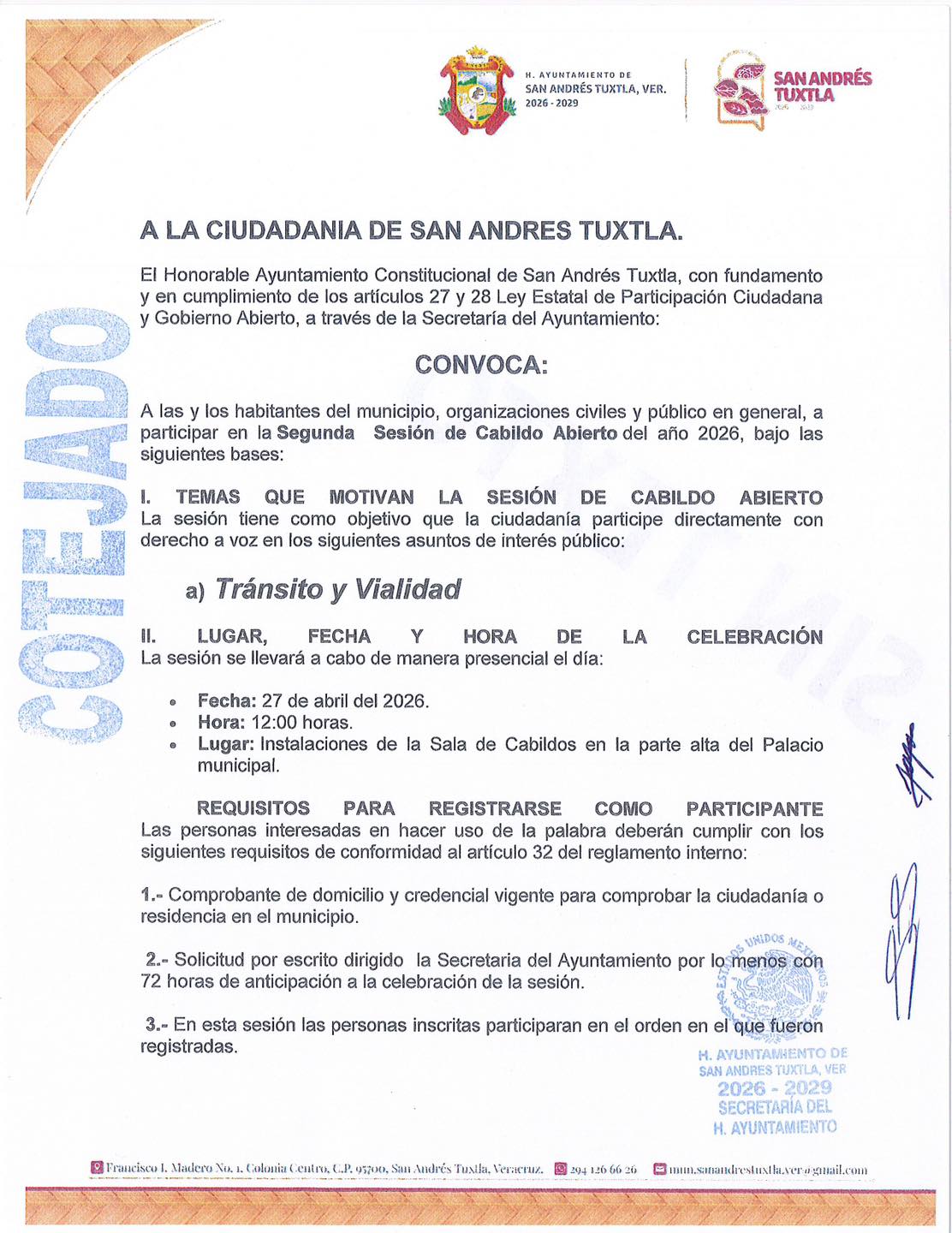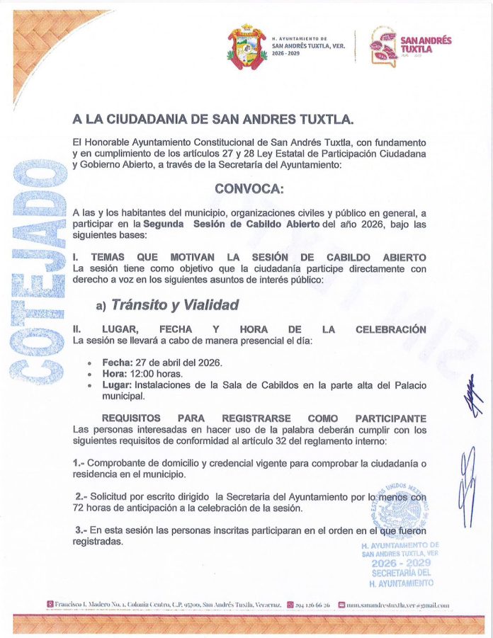 San Andrés Tuxtla, Ver.— El H. Ayuntamiento de San Andrés Tuxtla, encabezado por el alcalde Rafael Fararoni Magaña, invitó a la ciudadanía a participar en la Segunda Sesión de Cabildo Abierto 2026, que se llevará a cabo el próximo 27 de abril a las 12:00 horas en la Sala de Cabildos del Palacio Municipal.