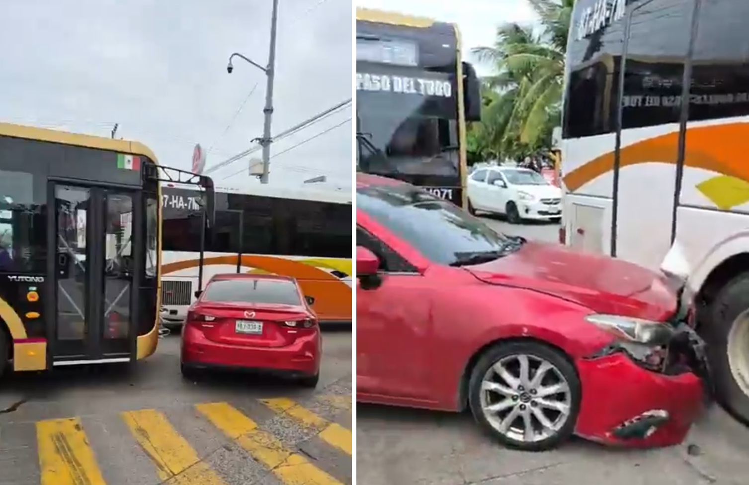 El primer percance ocurrió en el cruce con la calle Úrsulo Galván, en la colonia Primero de Mayo Sur, donde una motocicleta en la que viajaba una pareja se impactó contra un camión de la línea Ulúa, ruta Los Robles–Paso del Toro.