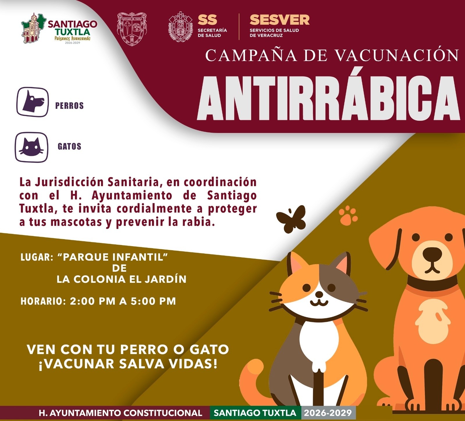 Santiago Tuxtla, Ver.— El H. Ayuntamiento de Santiago Tuxtla, encabezado por el alcalde Noé Domínguez Cadena, en coordinación con la Jurisdicción Sanitaria, invitó a la ciudadanía a participar en la Campaña de Vacunación Antirrábica dirigida a perros y gatos.
