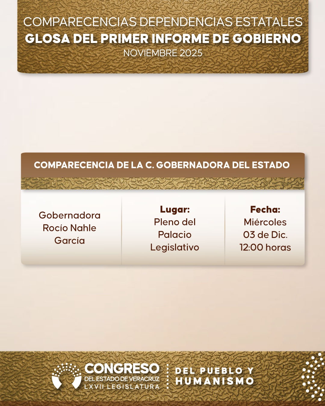Para efectos del cumplimiento con lo dispuesto en el Artículo 49 constitucional, la comparecencia de la gobernadora del estado, Rocío Nahle García, está programada para el miércoles 3 de diciembre a las 12:00 horas, ante el Pleno legislativo.